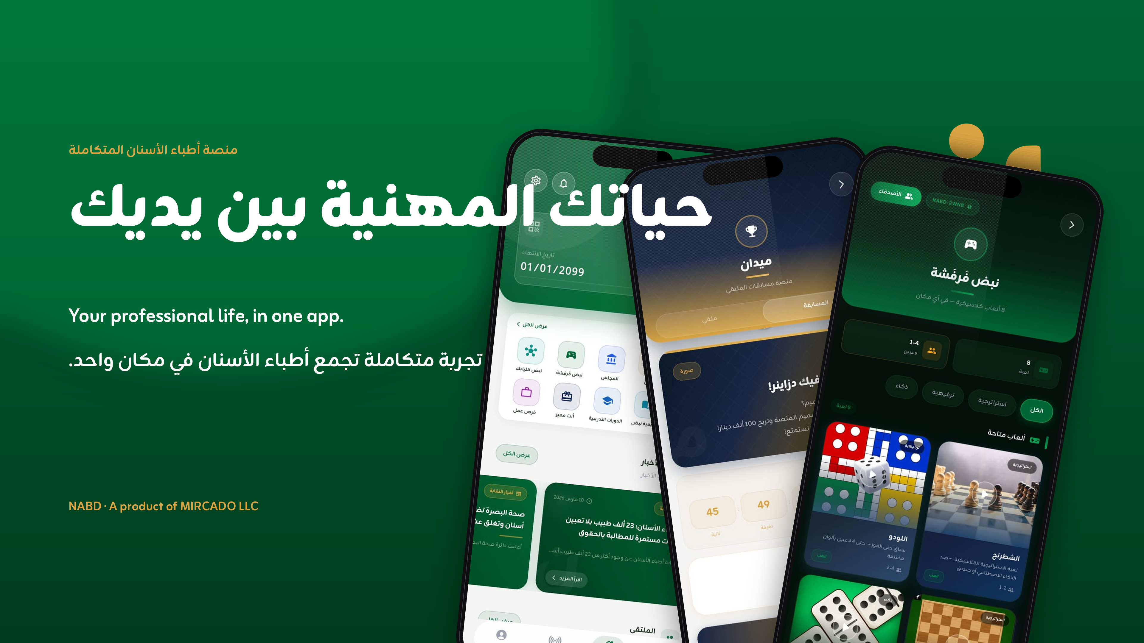 NABD is the first identity-verified dental super-app for the Middle East's dental community. It bundles a verified digital membership card, continuing education, an AI study and productivity assistant, clinic management, and creative contests in a single Arabic-first app. Built natively for iOS and Android. A product of MIRCADO LLC.