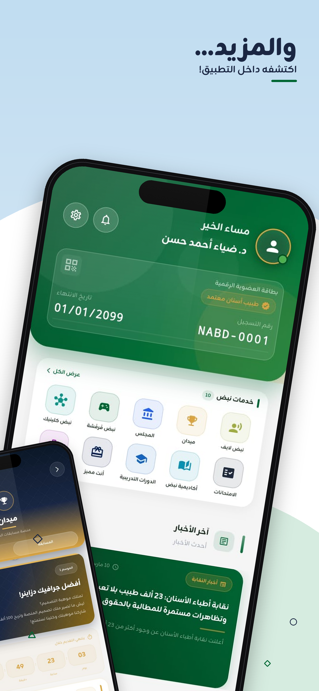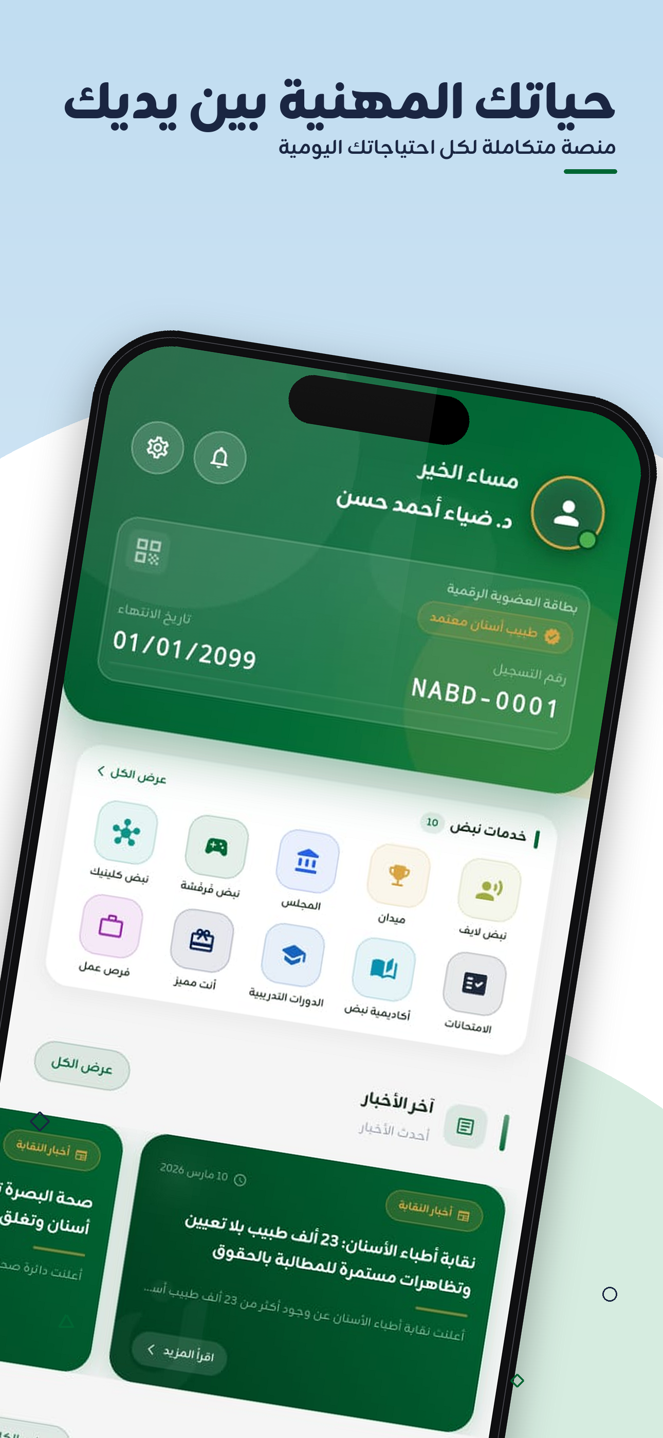 NABD is the first identity-verified super-app for the Middle East's dental community. Every member proves professional identity via NFC or OCR scan of their syndicate card, paired with live biometric matching — protecting community quality and blocking impersonation. Inside the app, dentists and dental students carry a verified digital membership card, take continuing-education courses and exams, use an AI assistant for study and daily productivity, run lightweight clinic-management workflows, and compete in creative professional contests. The experience is Arabic-first and fully RTL-aware, runs on iOS and Android, and is built by MIRCADO LLC.